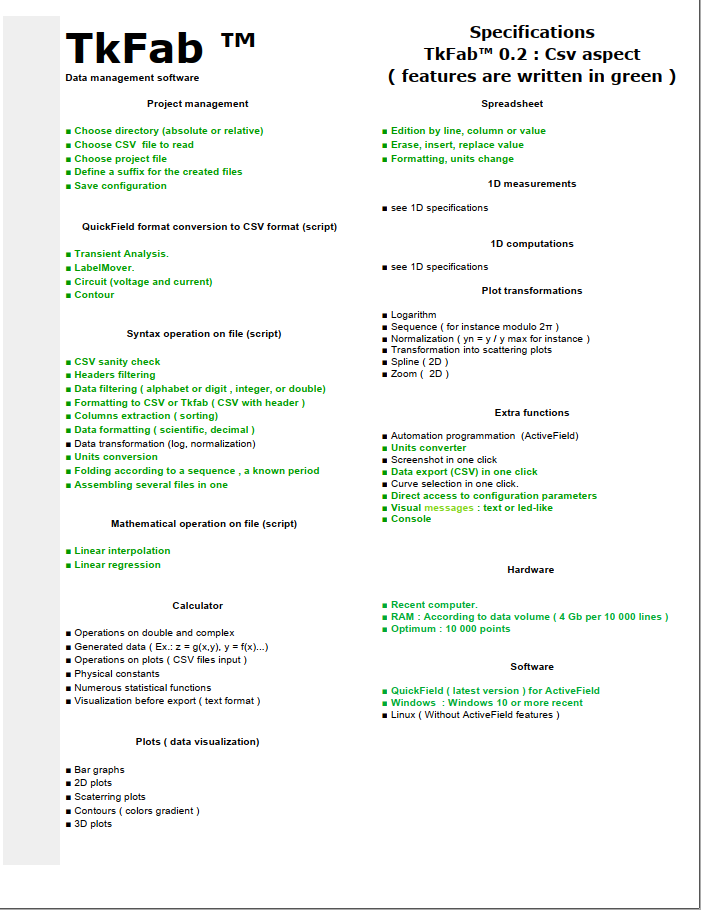 TkFab application main parameters